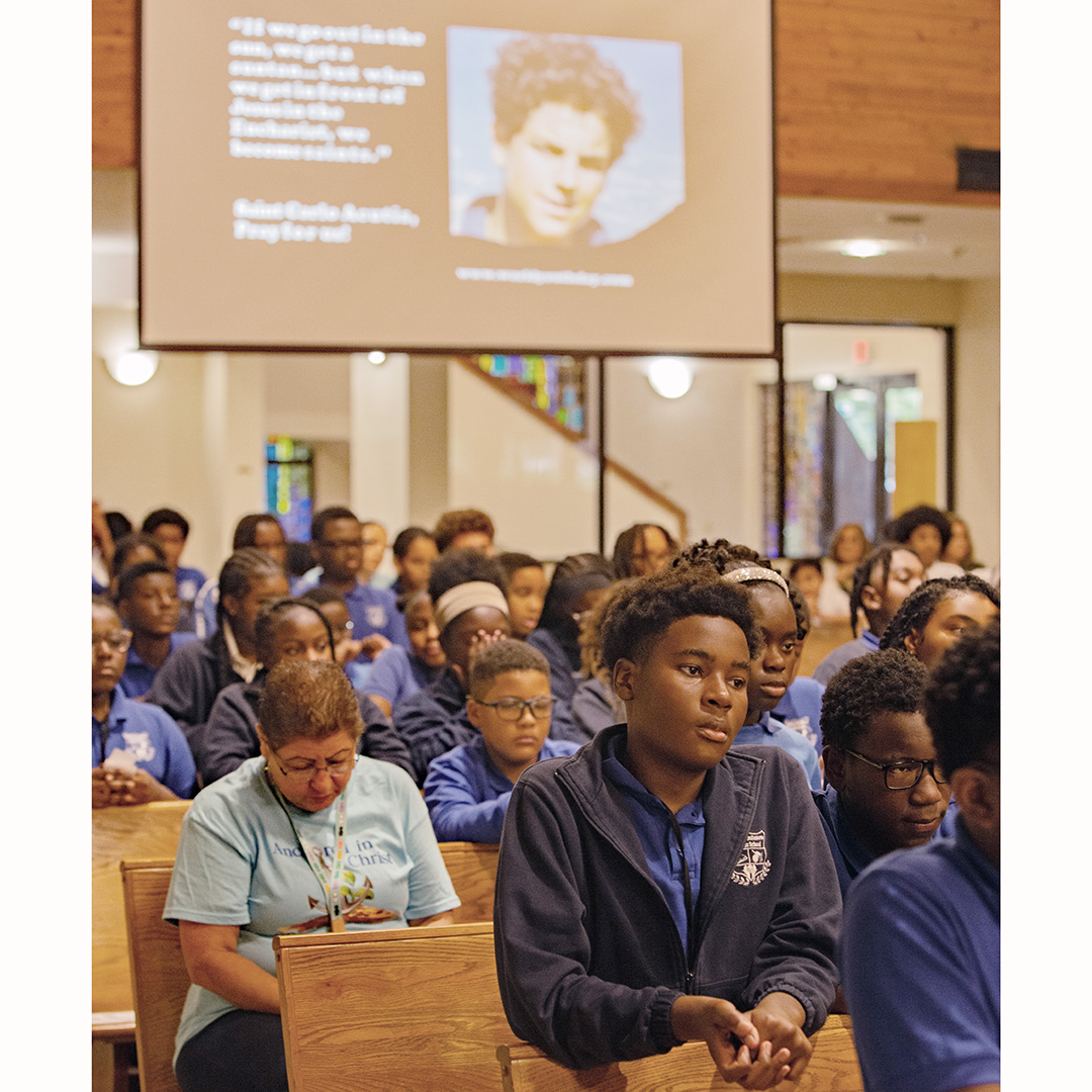 Student from 17 archdiocesan middle schools participated in a Holy Hour in the presence of a first-class relic of St. Carlo Acutis, the first millennial saint, at St. David Church in Davie, Oct. 10, 2025.
