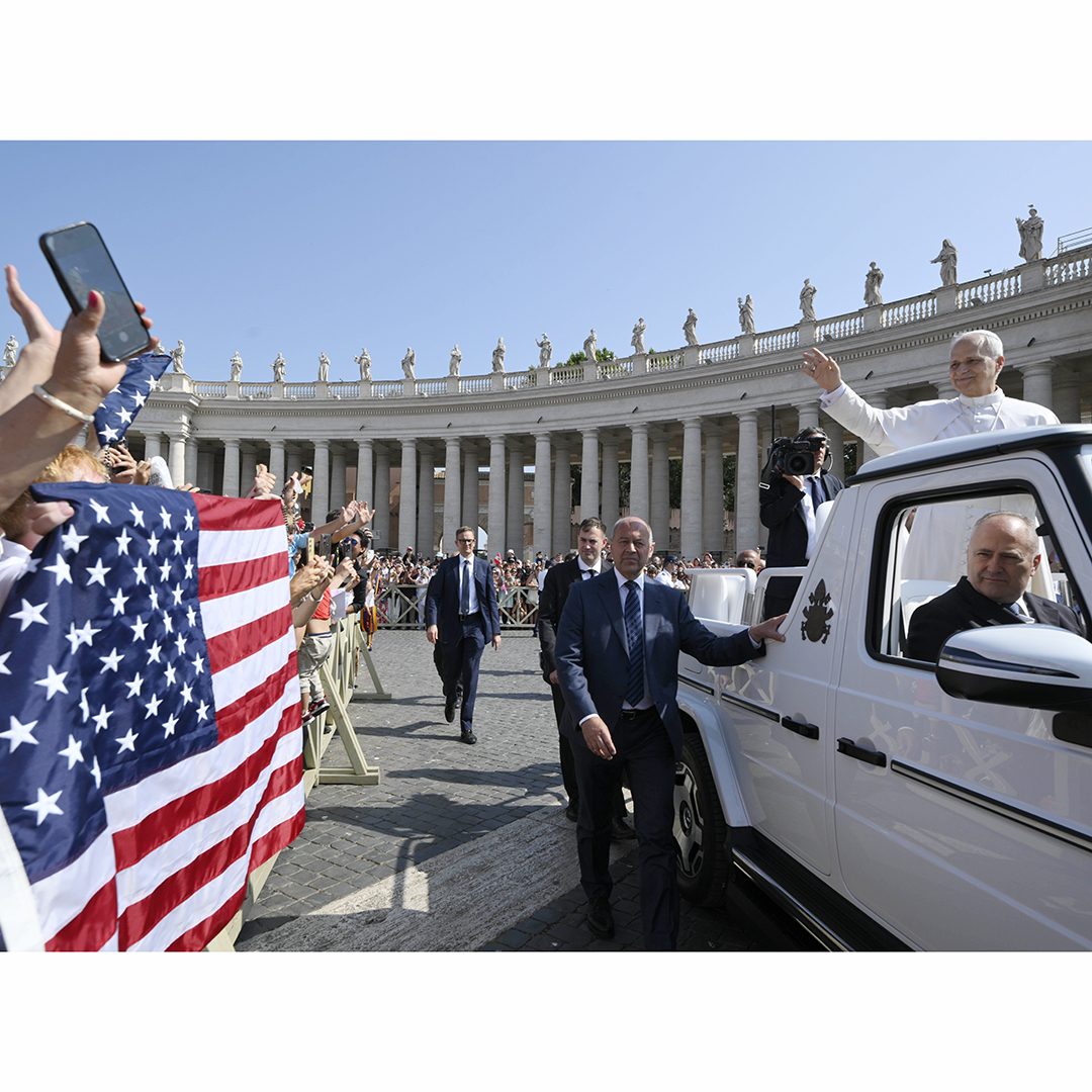 Pope Leo XIV waves to pilgrims holding a flag of the United States as he arrives in St. Peter's Square on the popemobile for his general audience at the Vatican June 18, 2025. The Vatican press office confirmed Feb. 8, 2026, that Pope Leo XIV has no plans to visit the U.S. this year. (CNS photo/Vatican Media)