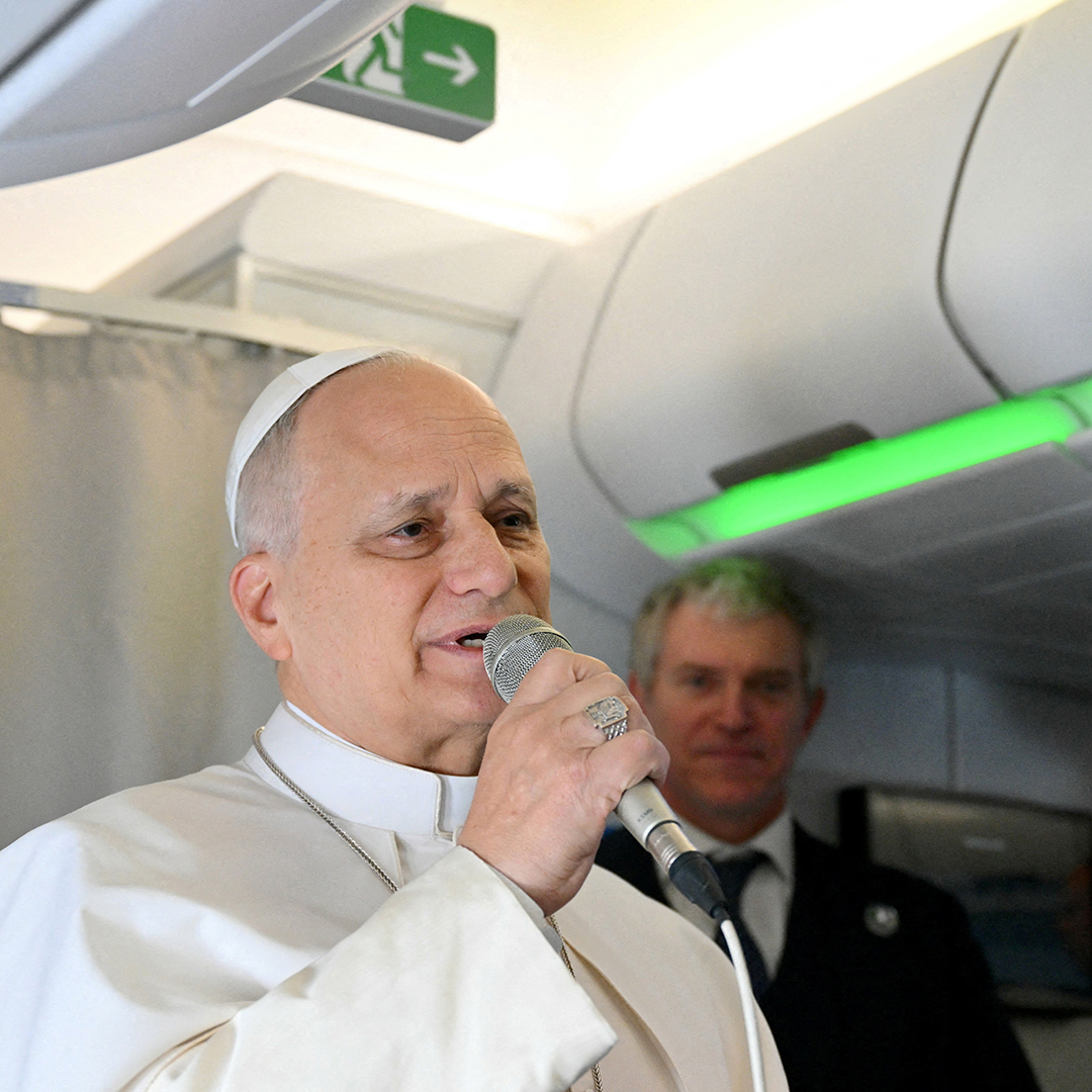Pope Leo spoke to journalists on the first flight of the pope's 11-day, four-country tour of Africa in which he will visit Algeria, Cameroon, Angola and Equatorial Guinea.